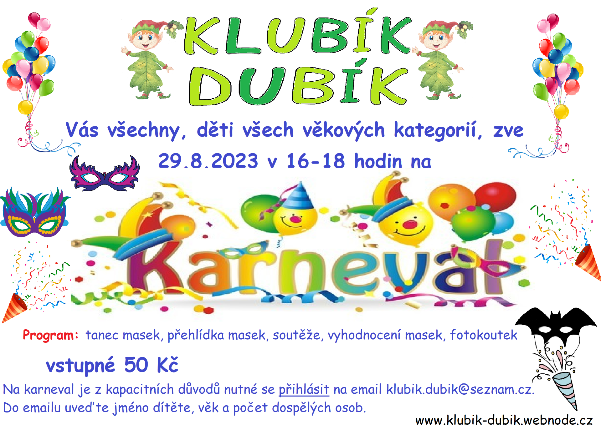 Přijďte se s námi na konci prázdnin pobavit do našeho KLUBÍKU DUBÍKU. Chystáme další akci pro malé i velké ....... bude KARNEVAL, 29.8.2023 v 16:00 odstartujeme párty. Nahoďte obleky, převleky, masky a přijďte si s námi zatancovat a zablbnout. Pokud náhodou vaše garderoba neobsahuje kostýmy a nechce se vám doma žádný vyrábět, tak mrkněte na půjčovnu Chobotnička.